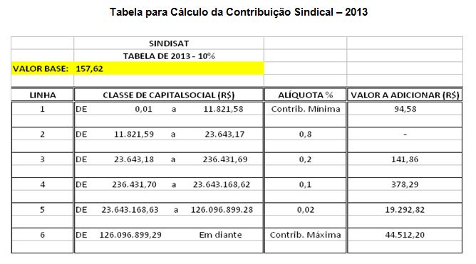 Tabela para Cálculo da Contribuição Sindical – 2013